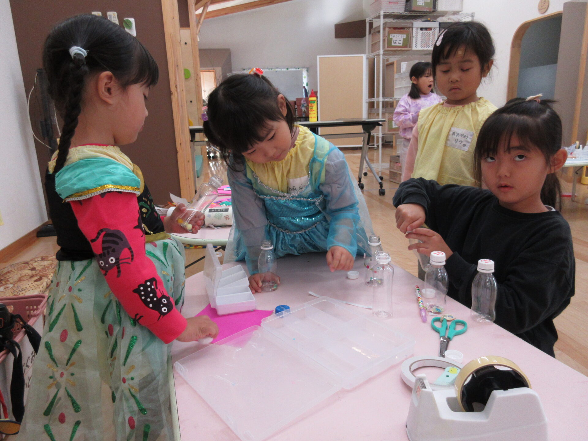 R-1の容器にビーズを入れて飾りを作ったり、ストローを切って中に入れ、シャカシャカ音がするマラカスを表現して喜びました。