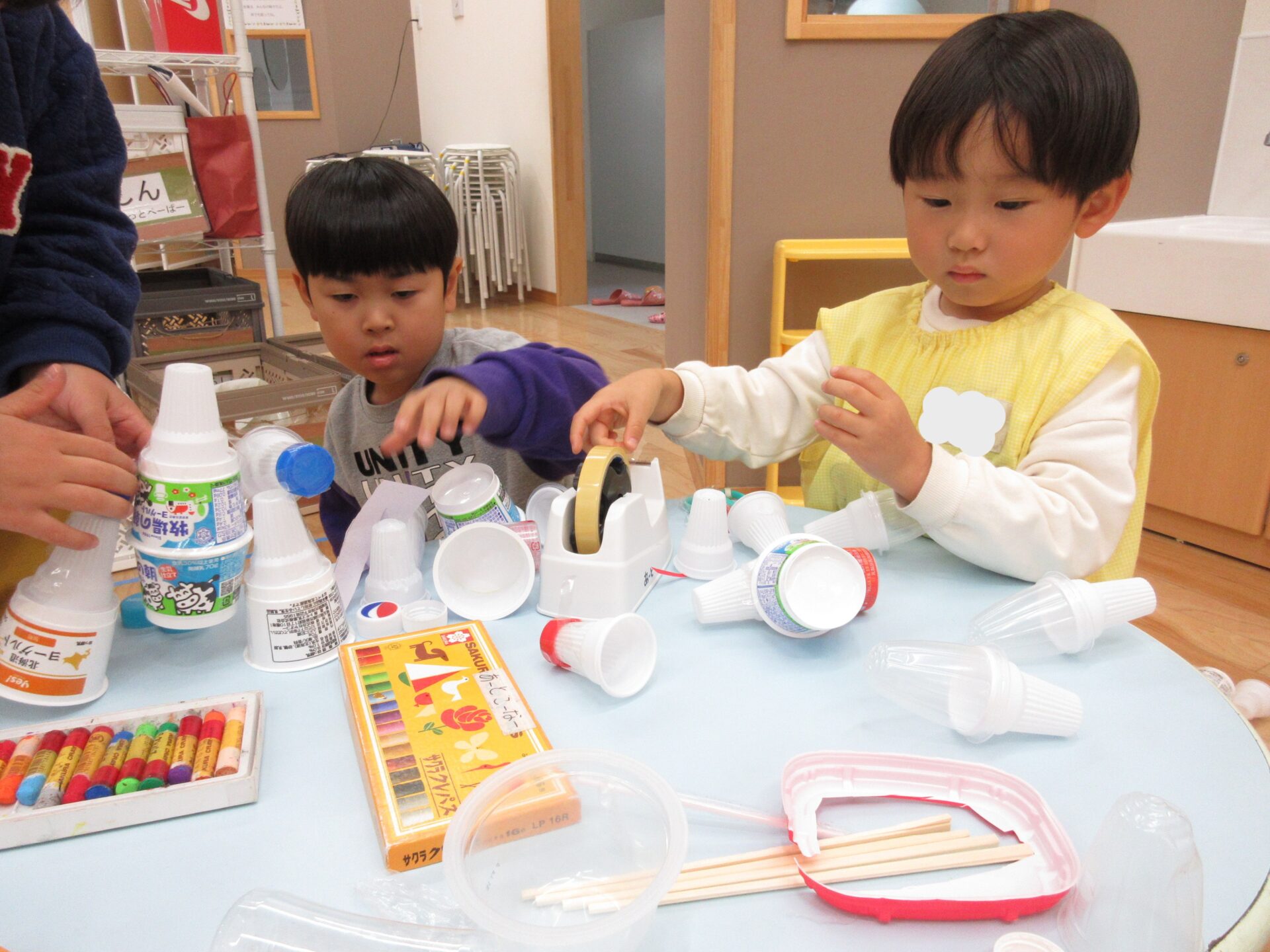 空き箱や空き容器をうまく組み合わせてロボットを表現する子もいて、その姿を見て、一緒に作ってみようと取り組む子もいました。分からない時には大きい学年の子に聞いて教えてもらったりと異年齢の関りも喜んで過ごしました。