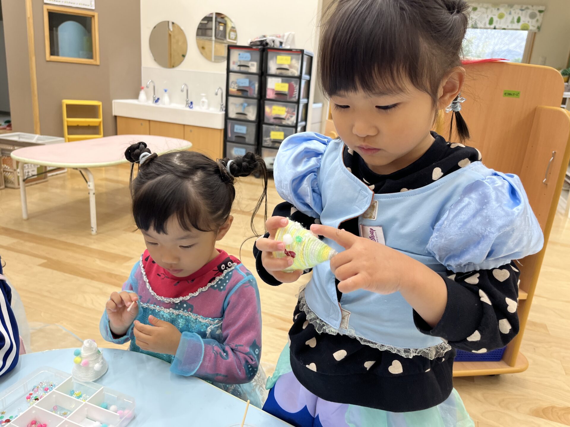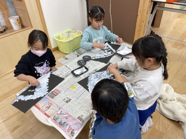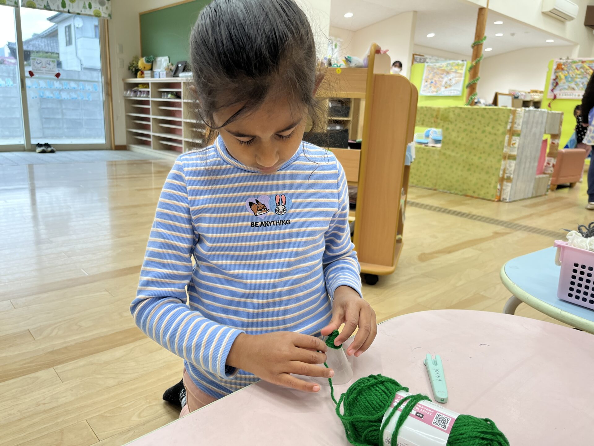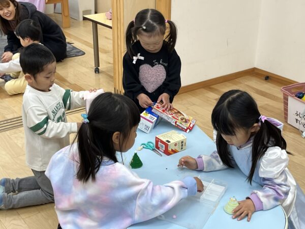 今週はクリアファイルを円錐型にしたものに、毛糸を巻いてクリスマスツリーを表現して楽しんだ。保育者が行っている様子をみて、年長児は材料を用意して自分で進めている様子も多かったです。後半に来た子へ前半からアートコーナーにいた子が作り方を伝えたり、少しずつ遊びの輪が広がったように思います。作ったものを箱に入れてアレンジする子もいて、色々な発想を形にして楽しんでいました。