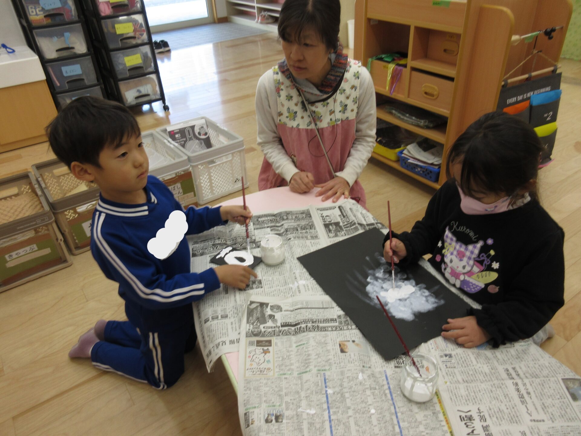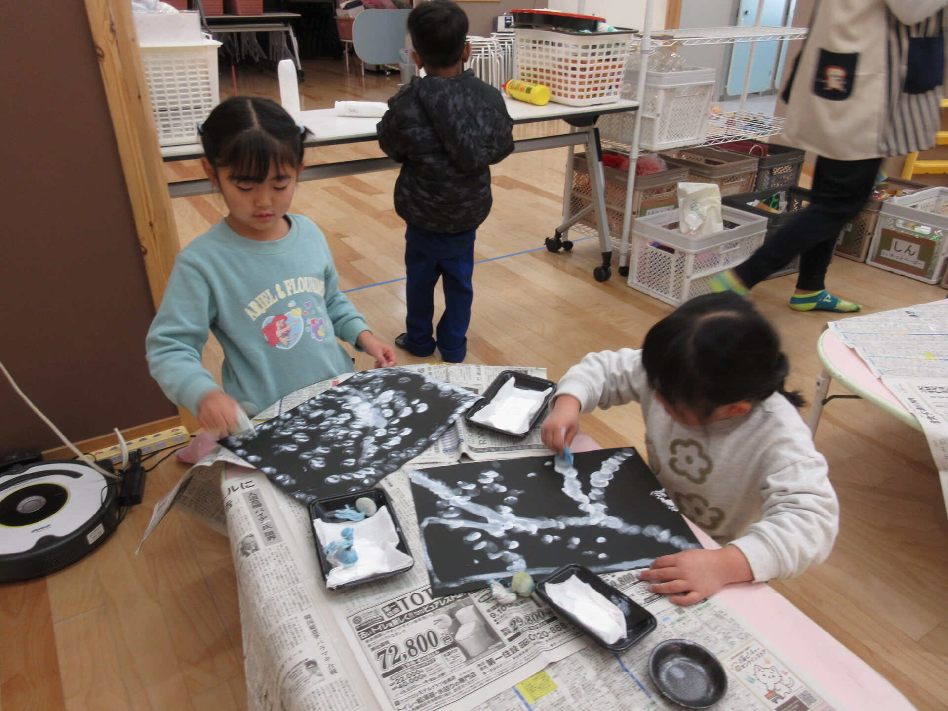 今週のアートコーナーは13日(土)のクリスマスコンサートで中学生に渡す、プレゼント作りを行いました。絵の具で雪を表現して、クリスマスツリーを製作しました。
