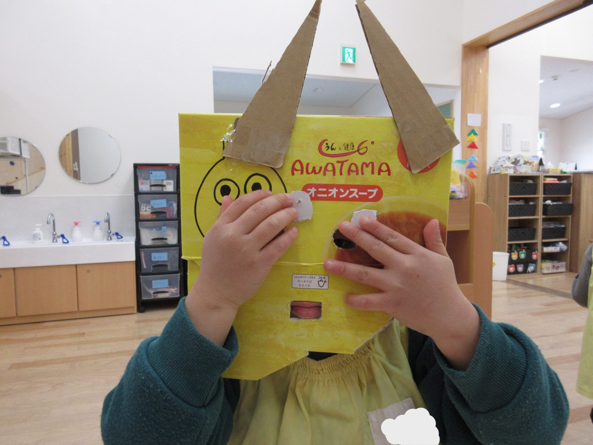 その他では、箱を頭にかぶりロボットのようにしたいと保育者に伝え、目や口が出るように穴を空けると本物のロボットだと喜んで身に着けていました。段々とアイテムが追加して、最終的にはクワガタロボットに変身して幼稚園に戻りました。