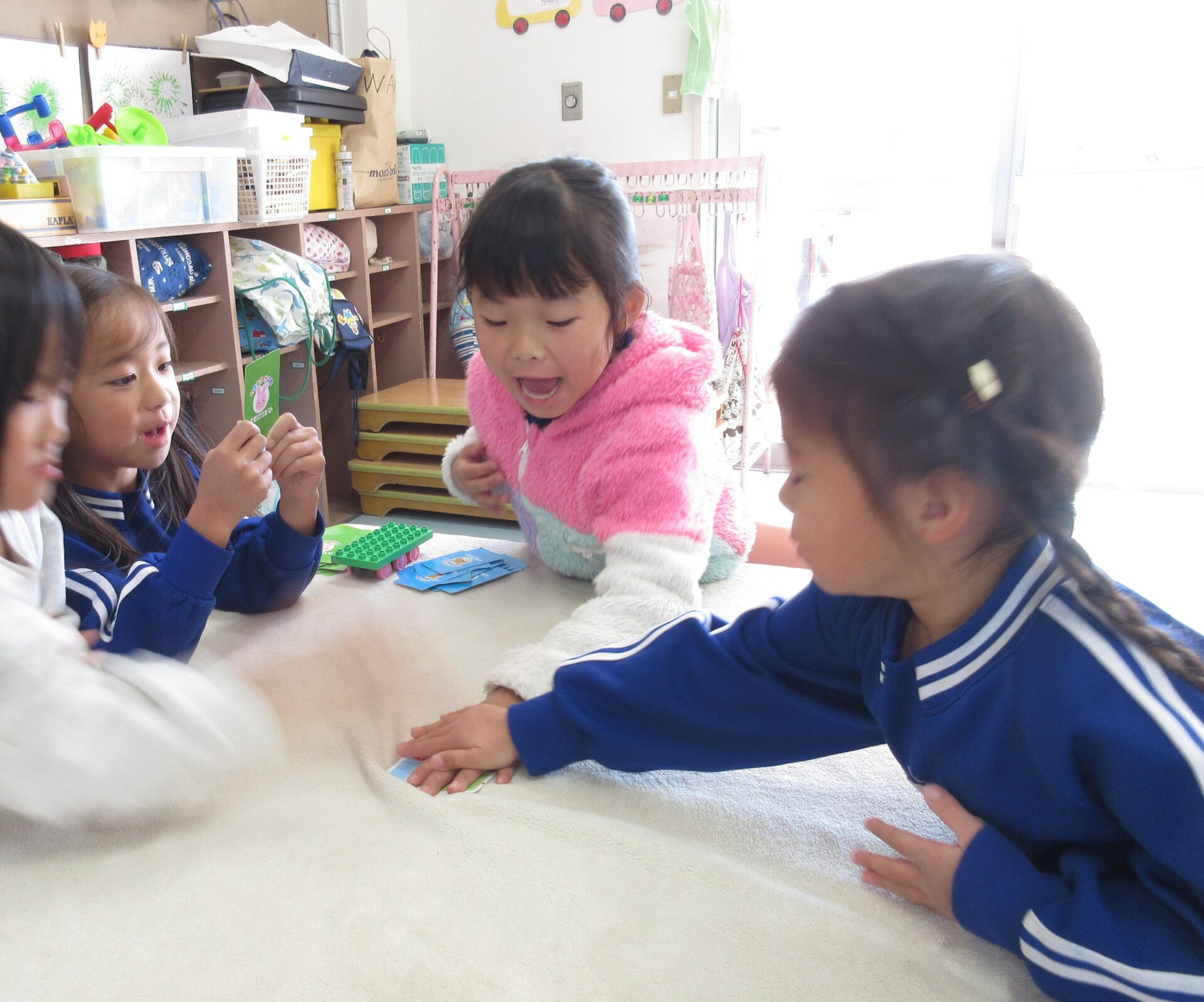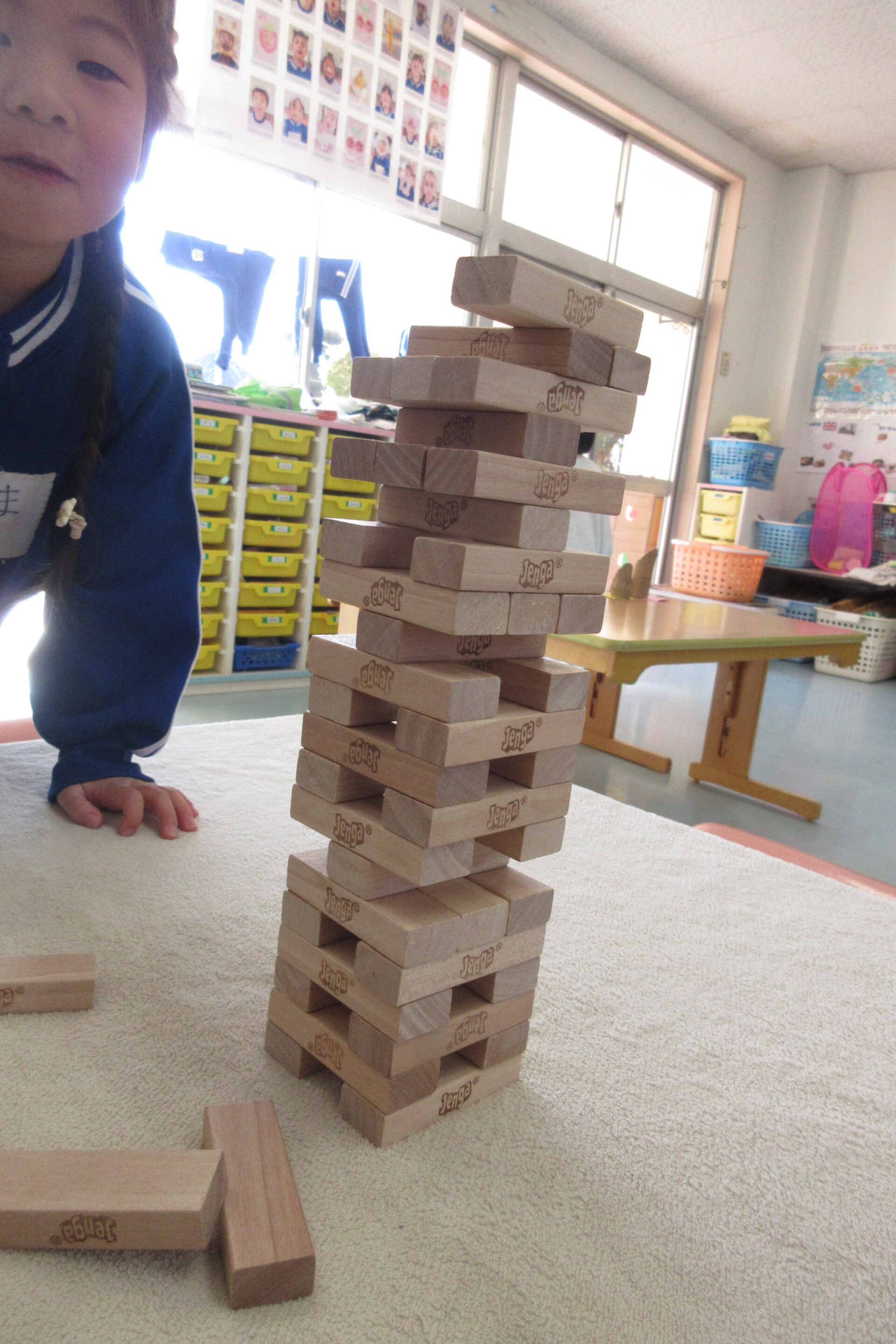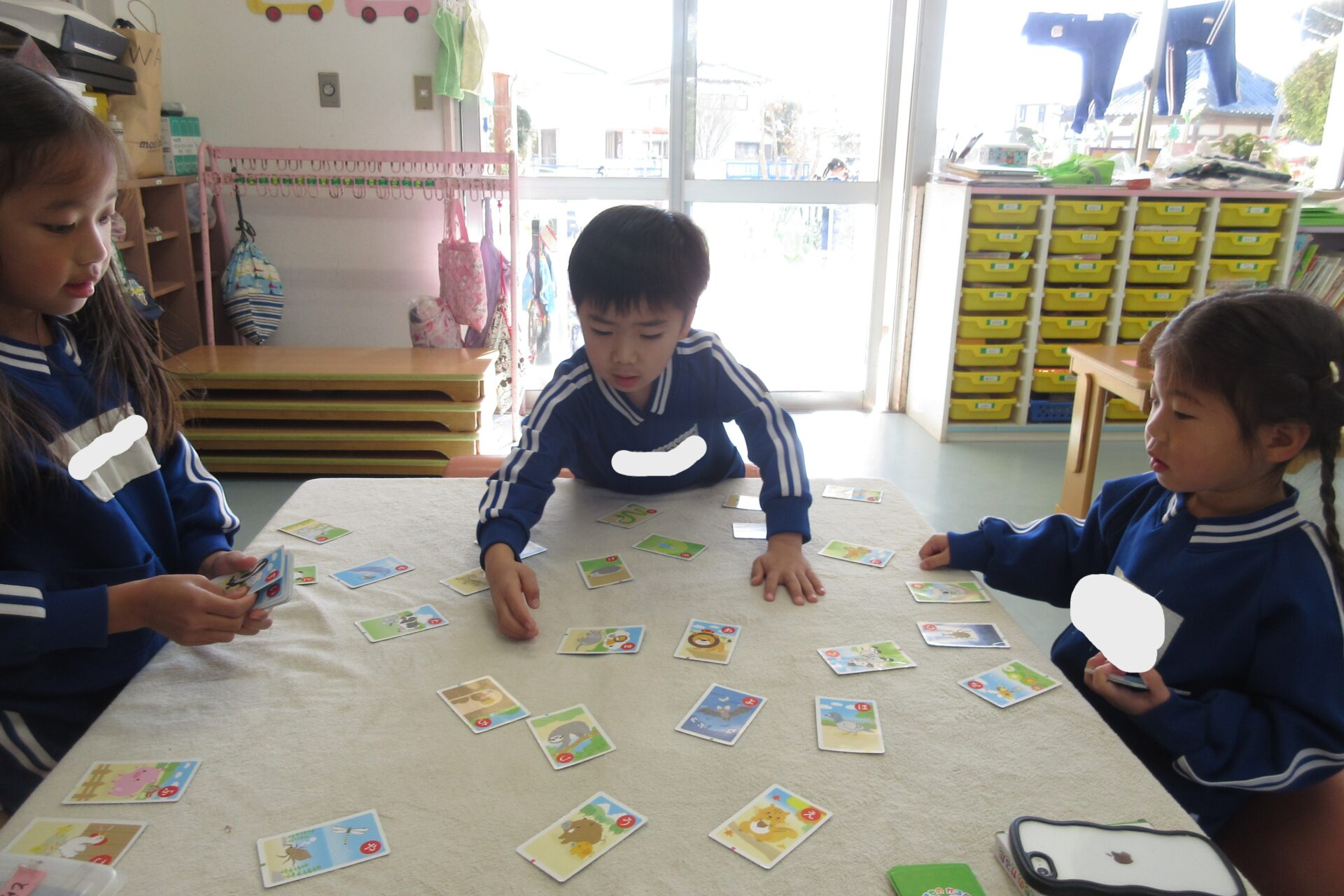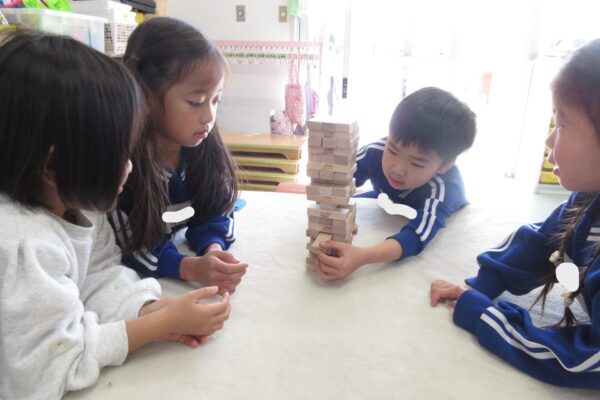 どこを抜くと崩れにくいかななど、経験から知っている子も多く教え合う姿も見られました。また、カルタ遊びを出してみると、読み手と取る人に分かれて自分たちで遊び進めていましたよ。文字も読めることが自信につながっている子が多いようです♪