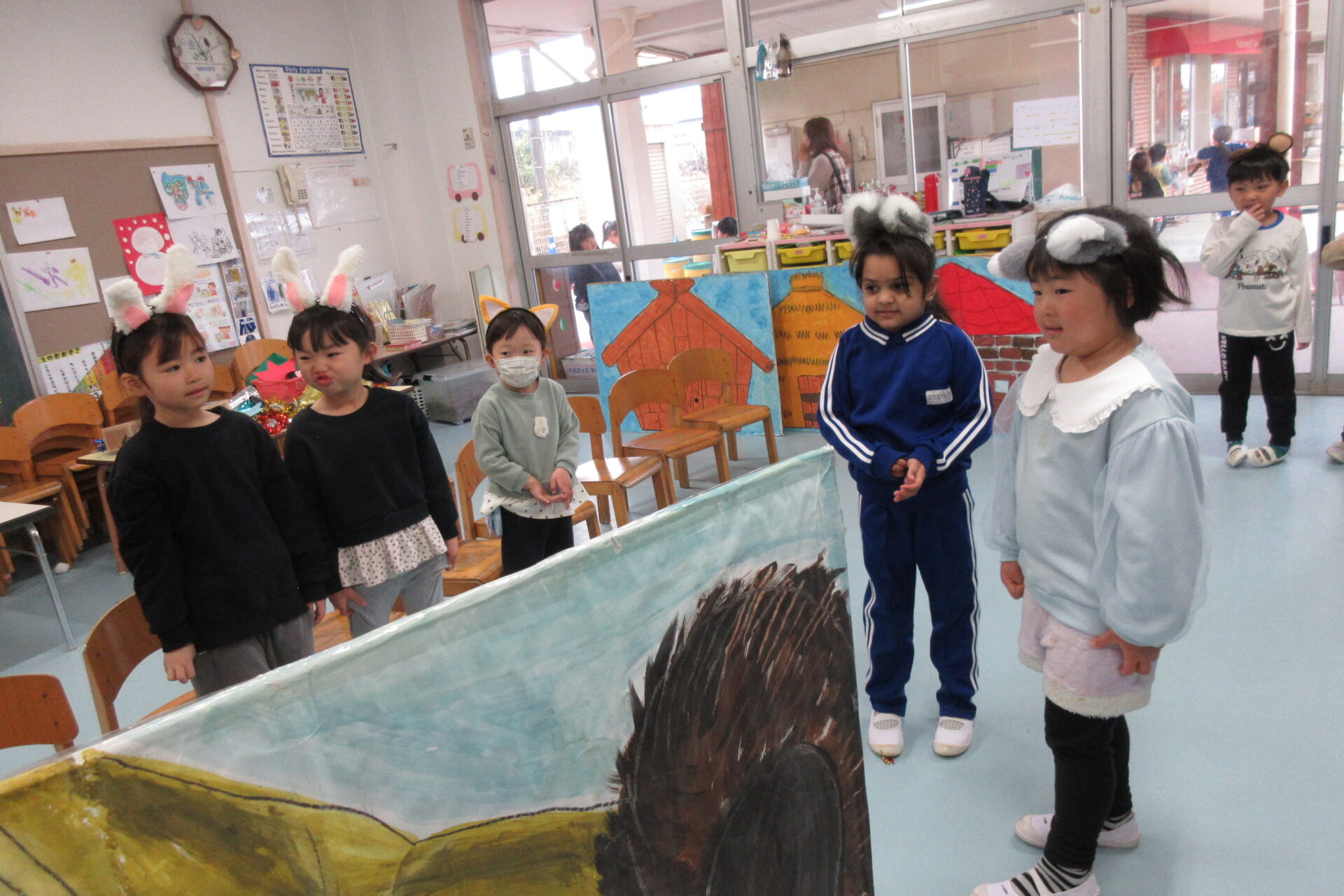 全体コーナー初日は、雨の為、室内で「シンキング」を使って体を動かして遊んだり、オペレッタの曲に合わせてごっこ遊びを楽しみました。お天気のいい日はウッドデッキをステージにして劇、オペレッタごっこをしていましたよ。