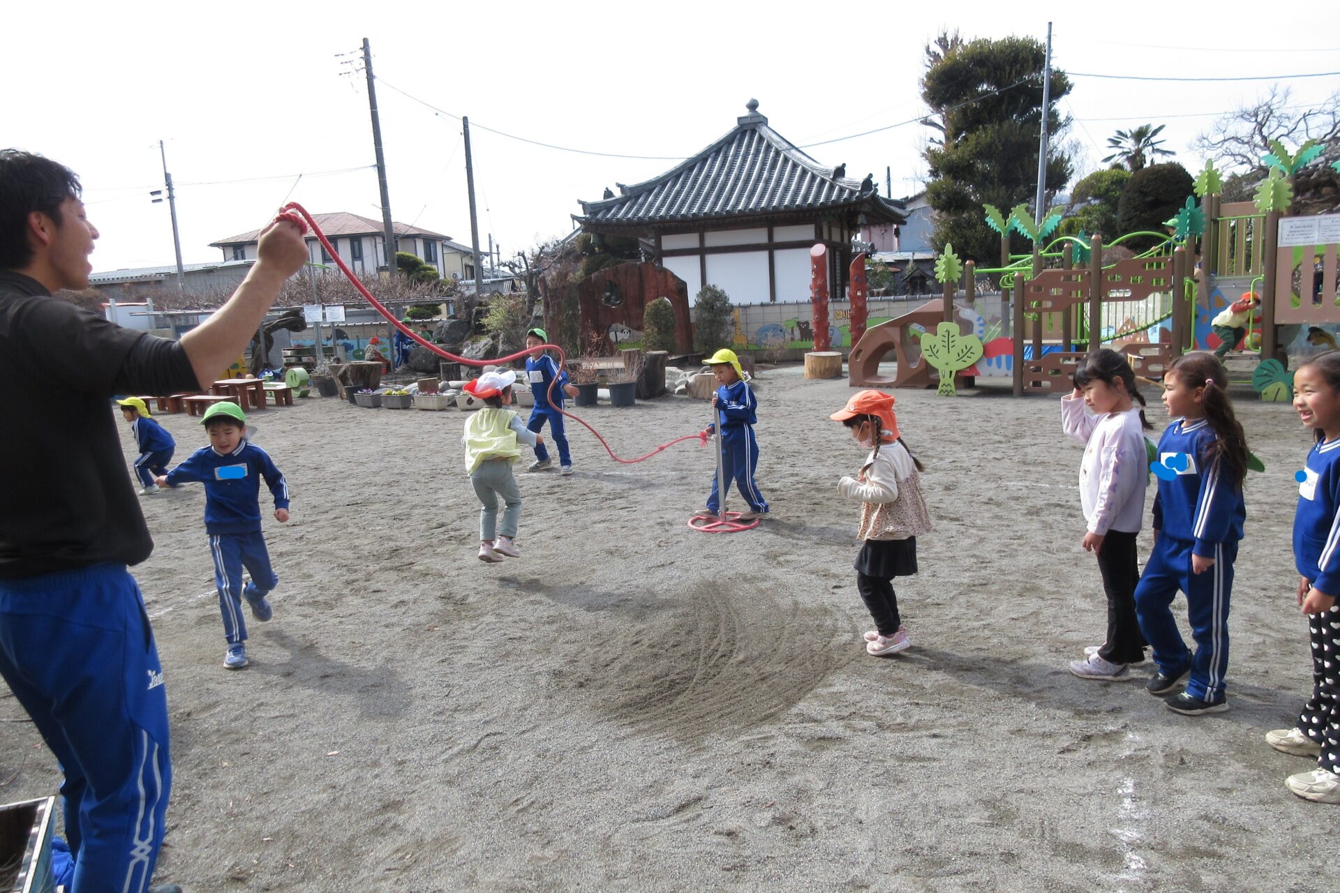 金曜日は、箱田先生と縄跳びにチャレンジ!大縄跳びでは、順番に縄の中に入って、跳んで抜けていく技にも何度も挑戦していましたよ。