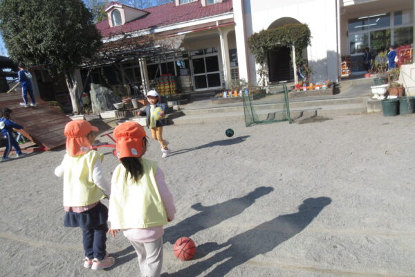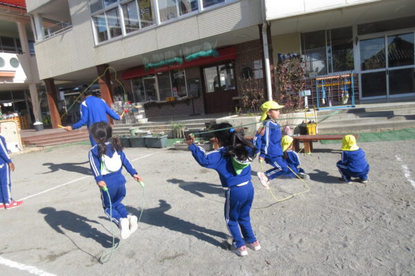 短縄にも挑戦する子が先週より増え、先生やお友だちと前とび競争をするくらいたくさん跳べる子も増えてきました。大縄跳びも友だちと一緒に跳ぶ事を面白がっています。