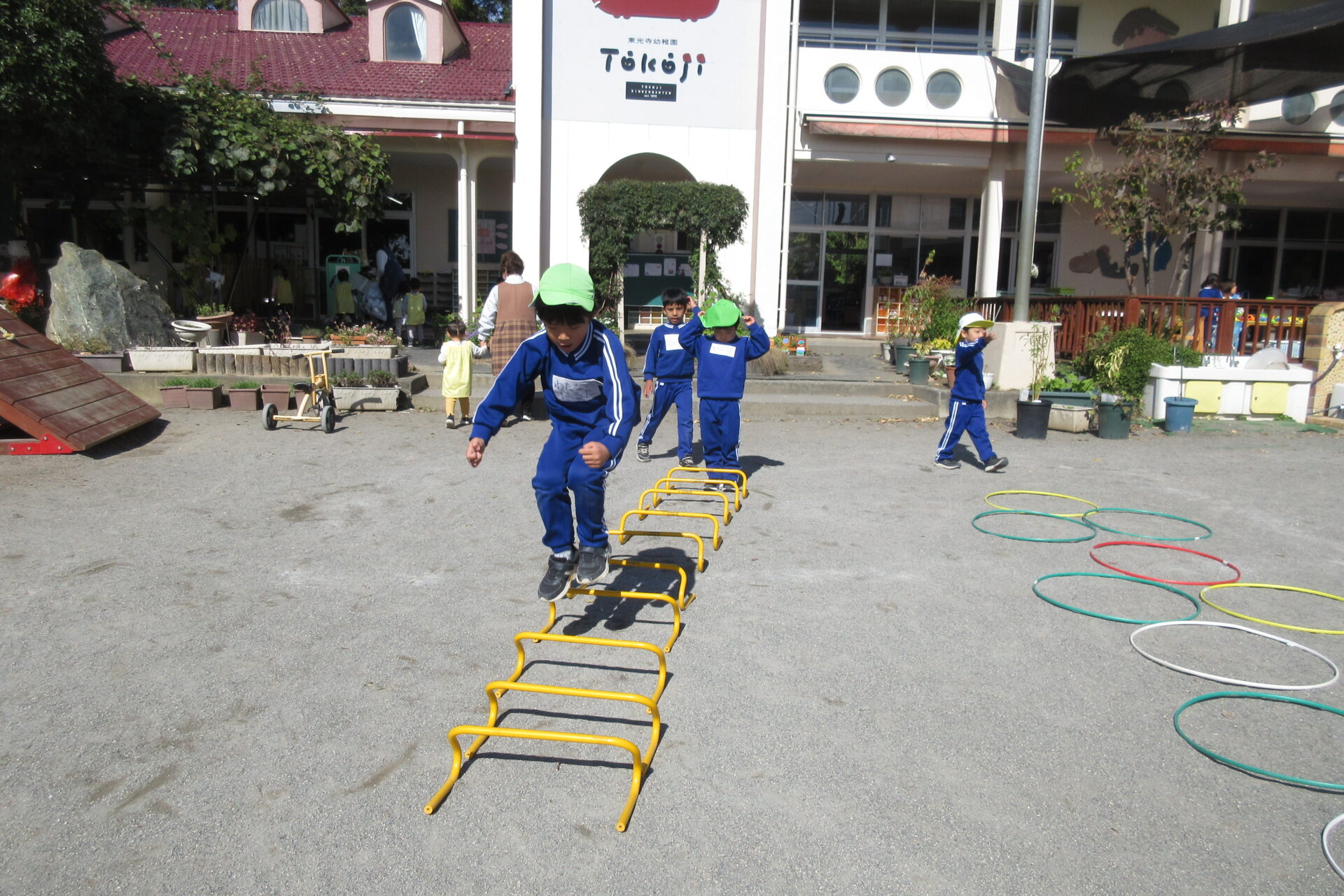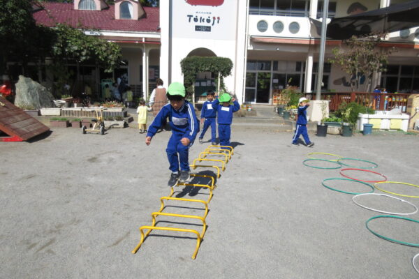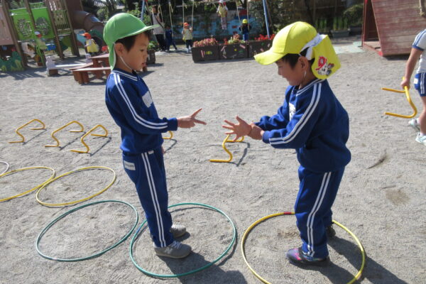 プラフープを使った遊びでは、フープを好きなようにおいてジャンプをしたり、速さを競うあそびや、カラーコーンに入るかどうかわなげのように遊ぶ、友だちとじゃんけんゲームをして、相手の陣地に先についた方が勝ち!など工夫をしながらいろんな遊びをしていました。