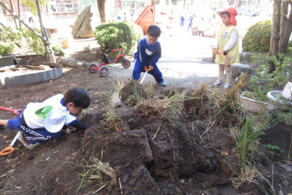 ホール前の自然コーナーでは、化石を見つける!といって砂場の砂とはまた違う土の感触を楽しもながら遊んでいます。
