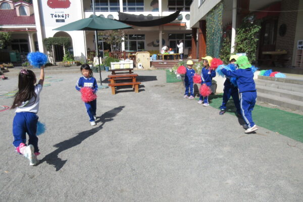 まだまだスポフェスの余韻を楽しんでいて、ポンポンでダンスをしたり、先生役になる子もいながら、スポフェスの日をイメージして幼稚園ごっこを楽しんでいました。