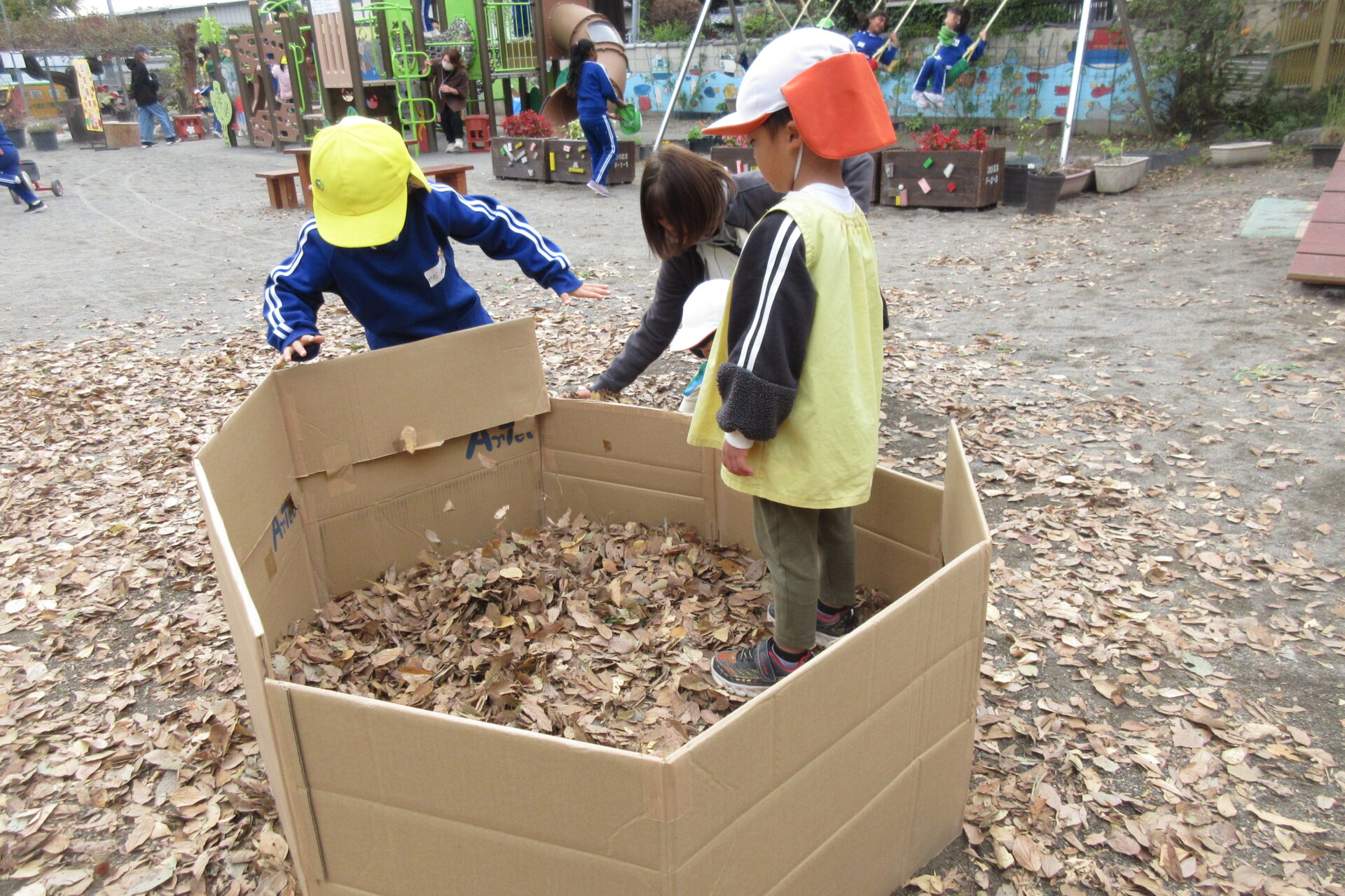 園庭の落ち葉を使って落ち葉のおふろが出来ています♪お友だちと協力して落ち葉を集めていっぱいにした中に入ると、「カサカサ」と音がしたり、「ふわふわ」していたり、とっても楽しい空間に大変身!