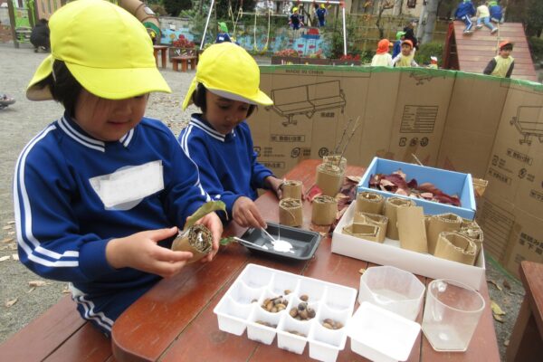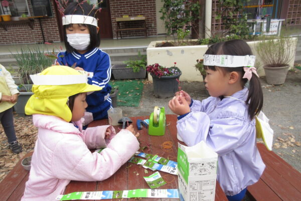 落ち葉や、木の枝、どんぐり、園庭の花を使ってかんむり作りやネックレスを作って身につけて遊んだリ、ボンドを使って丸めたダンボールに貼りケーキ作りもしています。