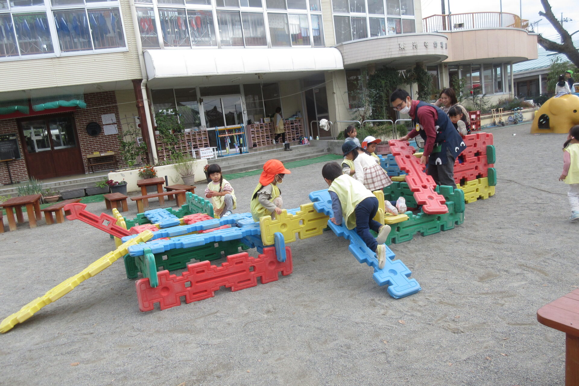 赤、黄色、青、緑のブロックを自由に組み合わせて家や足湯、滑り台、ベッドとイメージを膨らませて形を作っています。ブロックを運ぶ時は、お友だちと一緒に運ぶとやりやすい事に気付き、声をかけ合って協力する場面もたくさん見られました。