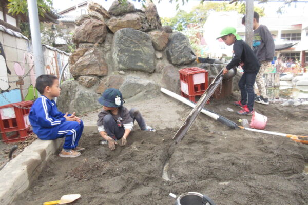 砂場でもお友だちと一緒に川作りや島作りをしていて、水をどんなルートで流していきたいか意見を出し合いながら遊んでいます。
