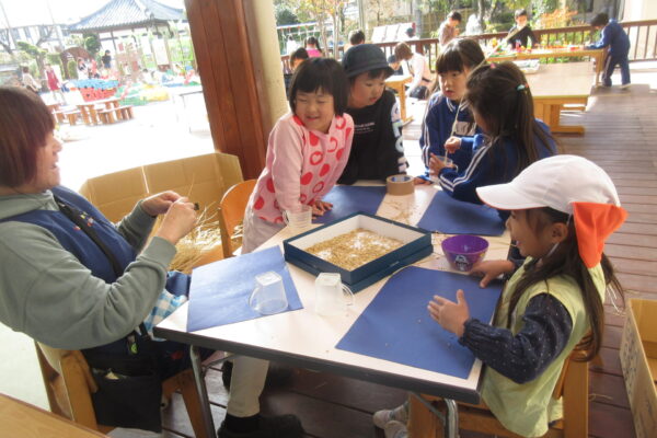稲の脱穀コーナーも設け、カップの中に稲の先を入れて少しずつひっぱていくと、きれいに取れます。