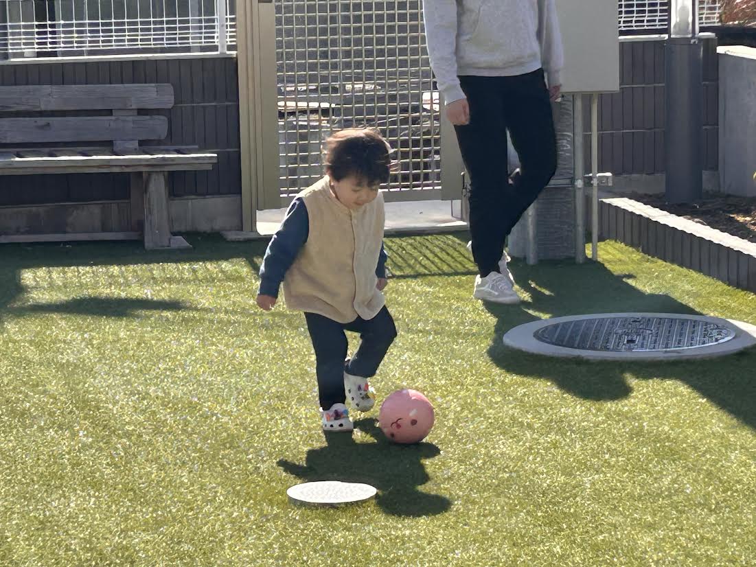 3歳児のお友だちは玄関から靴を持ってきて、「そとにいくよ!」とアピール。外遊びを楽しみにしている気持ちが伝わってきました。