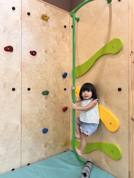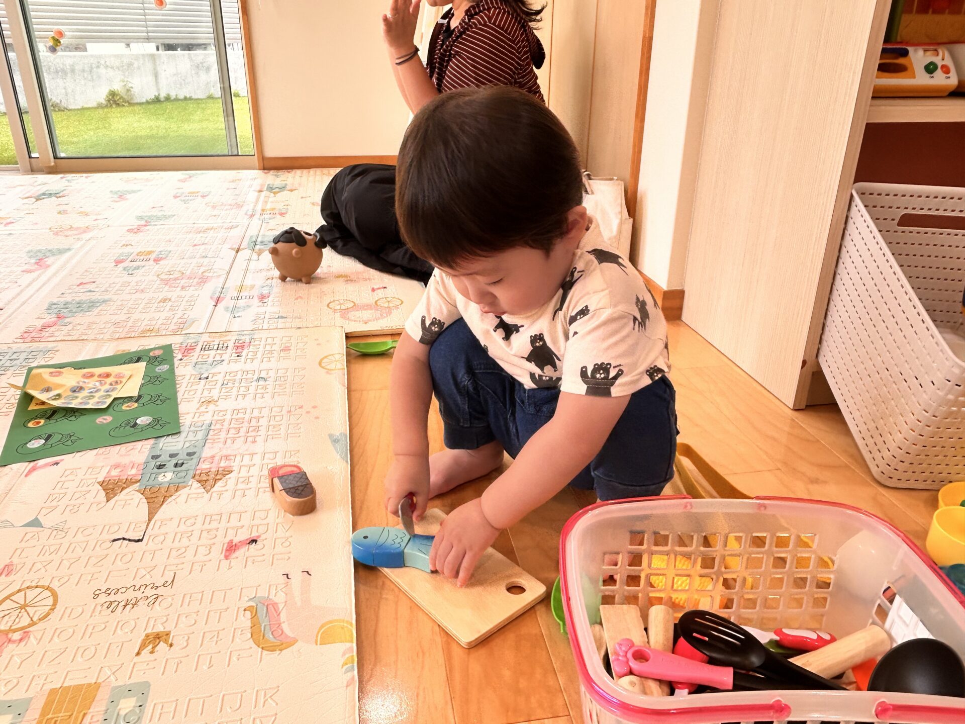 たまごぐみさんが来たのに気づくとすぐに長靴を履いて、一緒に元気いっぱい走りまわる姿がありました。お部屋ではマジックテープのおままごと食材を夢中で切って楽しむ姿も✨