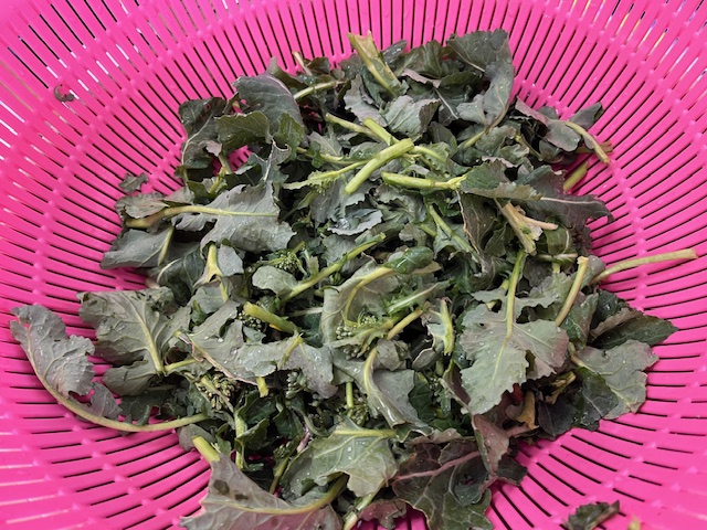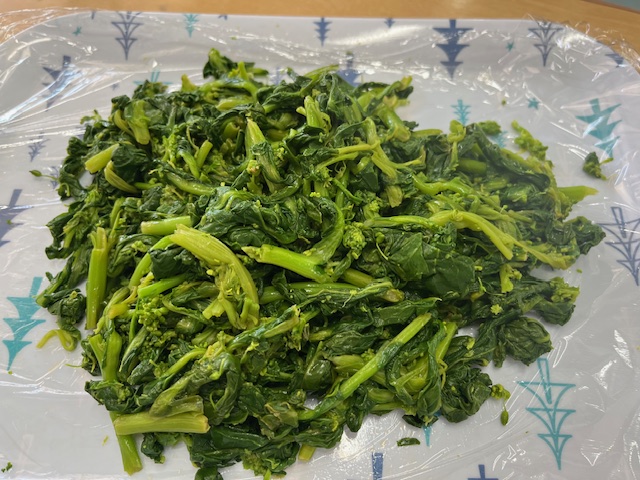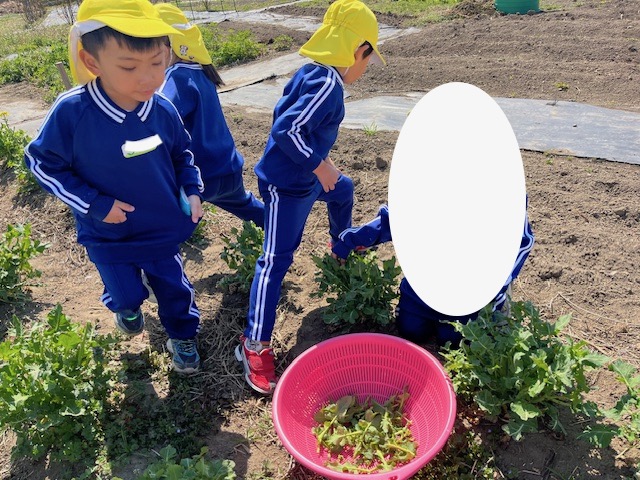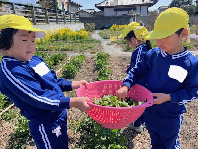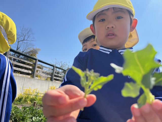 はらっぱに遊びに行ったもも組さん。春をたくさん見つけました。その1つが昨日食べた「かき菜」。葉っぱやつぼみを探して収穫しました。早速お部屋に持って帰り、目の前で茹でて食べました。「おいしい!」と幸せいっぱいのお顔でした。