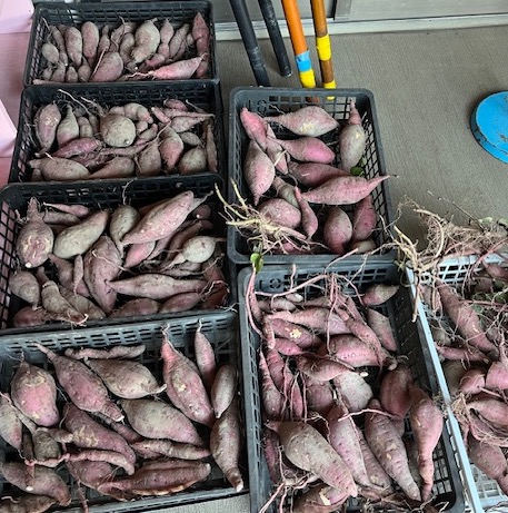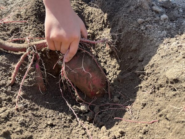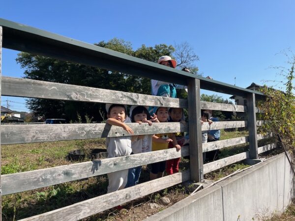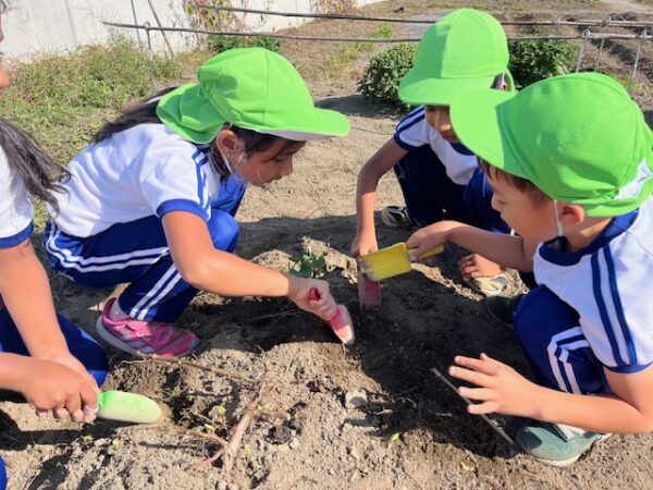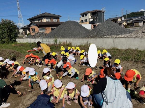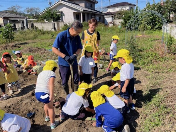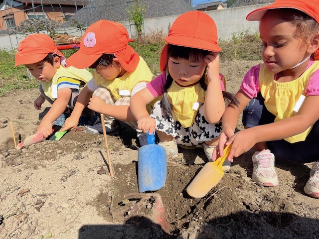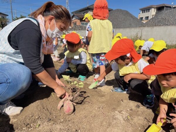 今日はとってもいい天気。さつまいも掘りをしました。一生懸命掘り進めていくと「お芋がささってる!」「生まれた!」と、おもしろ発言続出でした。さつまいもは、なかなかよく育っていました。お散歩中の1歳児クラスのお友だちも興味津々でした。少し干して、焼き芋大会をしましょう。 2歳児クラスと、ぽっか親子クラブのお友だちは22日水曜日に行います。お楽しみに。