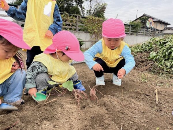 今日は、2歳児クラスと、ぽっかぽか親子クラブがさつまいも掘りを行いました。みんな一生懸命土を掘り、引っ張り、大きなさつまいもが採れました。1ヶ月くらい干して、焼き芋をします。お楽しみに。 さつまいも畑はすっかりきれいになりました。少し寝かせて、また来年です。