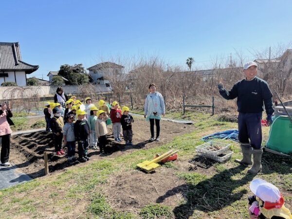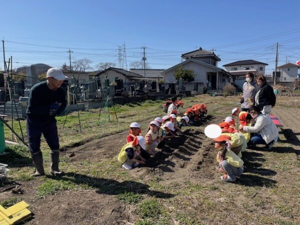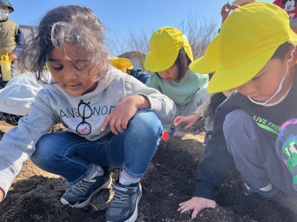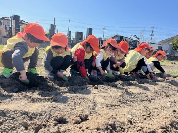 年少、年中組のお友だちが、じやがいもの種芋植えを行いました。手がすっぽり入るくらい穴を掘り、種芋を芽を上にして置いて、優しく土をかけました。「おおきくなぁ〜れ」とパワーを送り、芽が出ることを楽しみに待っています。