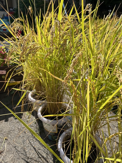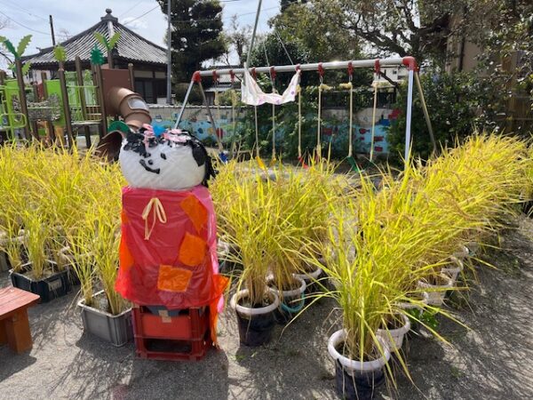 年長組さんが作った「かかし」と「たこ」が、稲を守ってくれています。黄金色になり、そろそろ稲刈り。今週中におこなえたらいいなと思います。