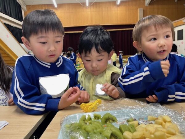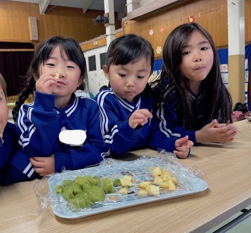 11月末からりんごと一緒に追熟させていたキウイフルーツが、やっと食べごろになりました。今年最後の味わいは、キウイフルーツです。今年は実りが少なく、収穫は4個だけでしたが、年少組はりんご、年中・年長組はキウイフルーツとりんごを味わいました。しっかり甘くなっていて、「おいしい!」という声が聞かれ、おいしいものを食べる喜びを感じるひとときとなりました。今年もたくさんの実りと出会うことができました。どうぞ、良いお年をお迎えください。