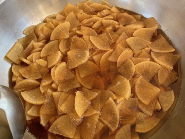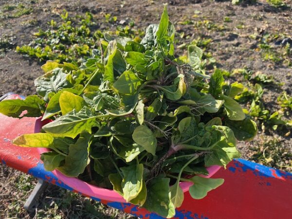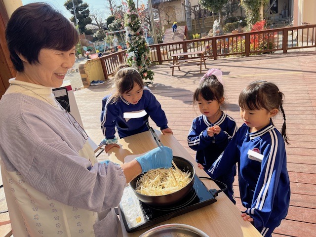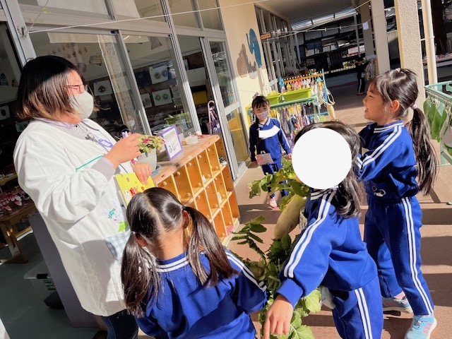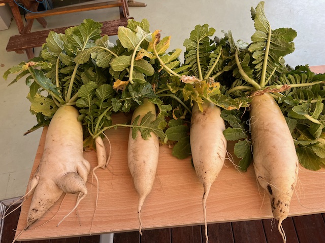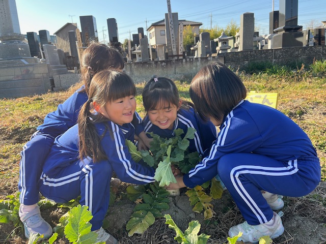 畑の大根も大きくなっています。今日収穫しました。「ん〜〜〜〜〜なかなか抜けない!手伝ってー!!」今年の大根はなかなか抜けない!力を合わせてやっと抜けました。新鮮大根をさっそく調理。今日は、「塩もみ」「きんぴら」「煮物」です。そして、ほうれん草は、湯がいてたべました。においをかいだり、味見を何回もしたり。どれも甘くておいしさがつまっていました。