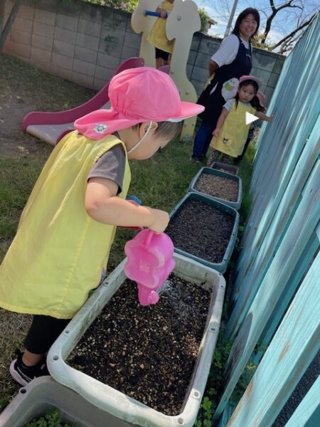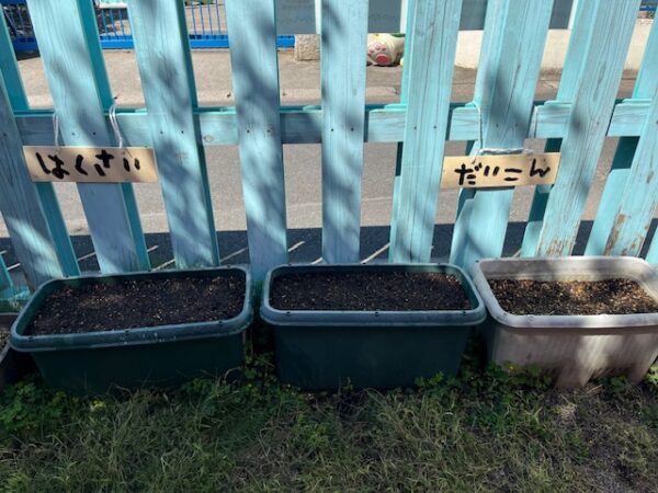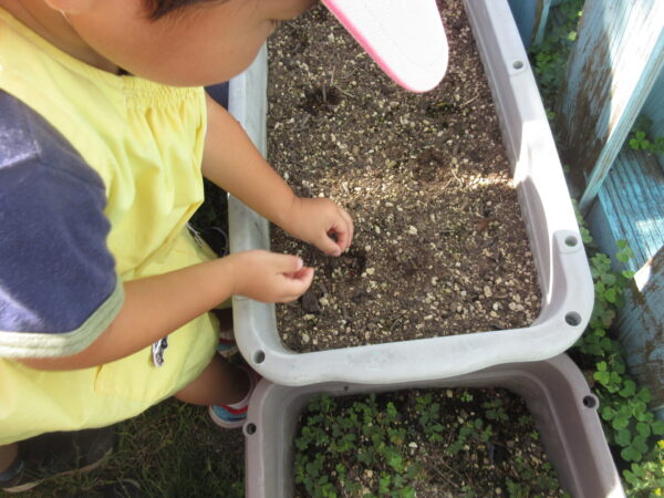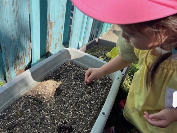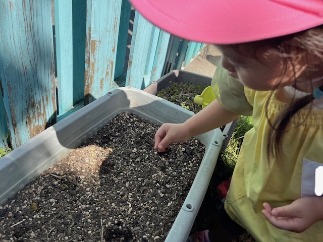 2歳児クラスのお友だちも、今日、大根の種まきをしました。赤い小さな種をじっくりと眺め、落とさないようにしながらまきました。お水を毎日あげてね、とお願いすると、「毎日あげる!」と元気いっぱい応えてくれました。頼もしいです。いつ芽がでるかな〜。
