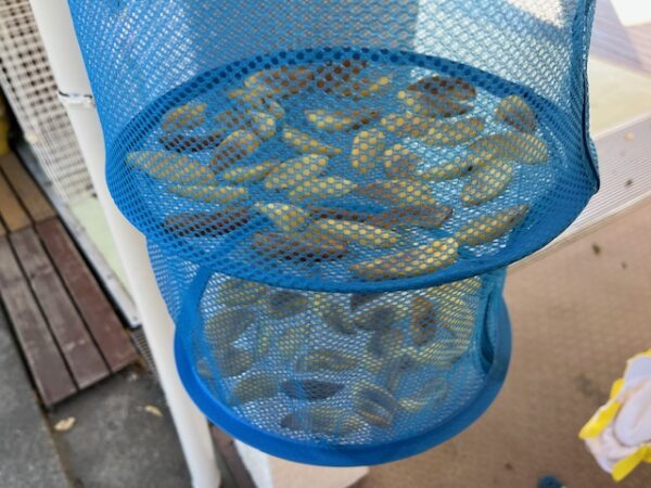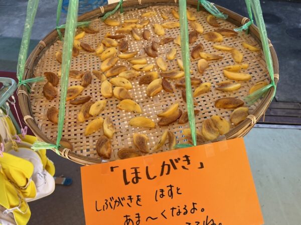 園庭には、柿が実っています。熟さないと渋いです。ですので、熱湯にサッと通して、干し柿にしてみました。先月は、丸ごと干しましたが、気温が高すぎたのか、カビてしまいましたので、今回は、薄く切って、干す期間を短くしてみようと思います。子どもたちは「なに?これ」と興味津々。出来上がって、食べられたら、子どもたちの反応が楽しみです。日本の秋の景色として、子どもたちの記憶に残ってくれたらいいなと思います。