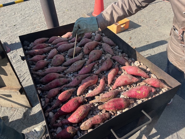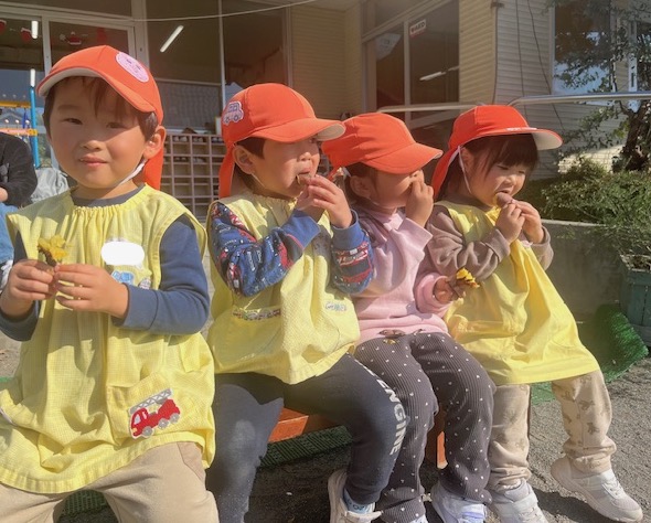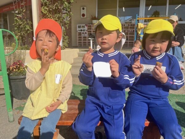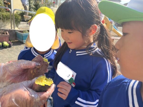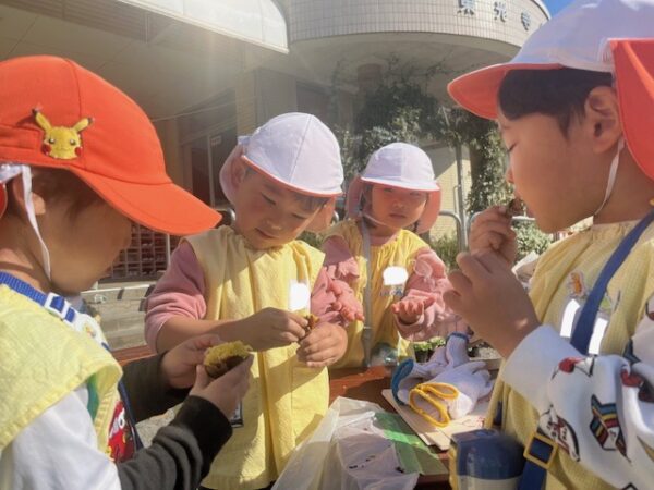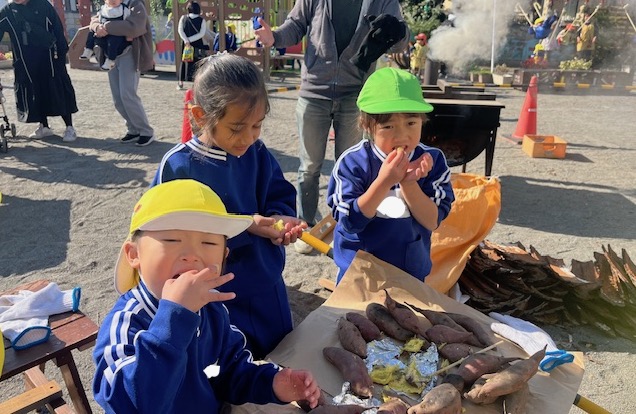 今日は待ちに待った焼き芋パーティーでした。火がつくと、焼き芋焼き機からもくもくと煙が出る様子や、匂いを感じながら、まだかなまだかな、とワクワクしている様子でした。焼けたサツマイモをぱかっと割ったときの湯気と美味しそうな匂いもまたこの時期ならではではないかと思います。焼きたてをもぐもぐ。みんなで美味しく食べました。