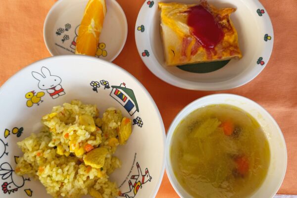 ♪きょうのポイント♪ 今日はカレーのいい香りがするピラフにしました。 鶏肉や野菜も入りバランスよく食べられます。 ■ランチ カレーピラフ スパニッシュオムレツ コンソメスープ オレンジ ■ぬくもりおやつ パリパリピザ