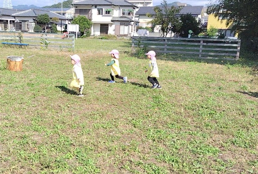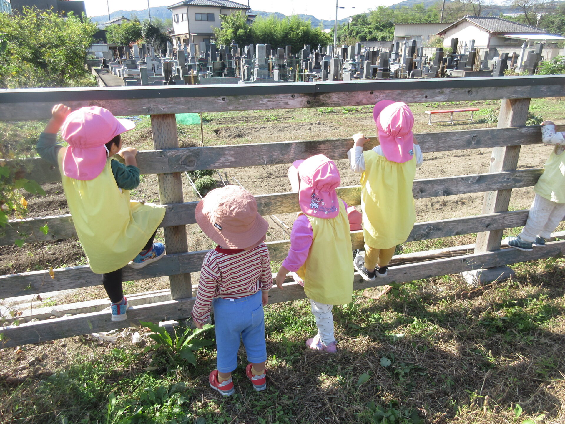 秋晴れの気持ち良い空気の中、子育てガーデン広場で元気に体を動かして遊んできました♪ 柵越しから、昨日さつまいも掘りをした畑が見えることを発見し、「お芋ないね」「(きのう)大きいお芋とったよ!」など、会話が弾んでいました♪